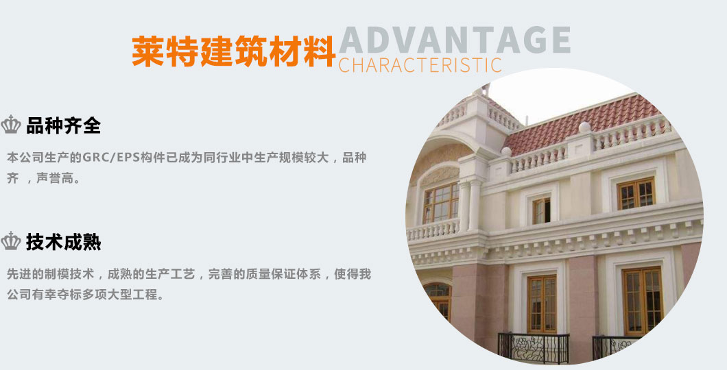 EPS/GRC產(chǎn)品是目前主導外墻裝飾的新型綠  色 環(huán) 保材料。較預制模板繁瑣的施工程序和高額的施工成本,更適用于安裝于外墻EPS,XPS保溫的墻體上。即能體現(xiàn)歐式、古典、高雅的裝飾風格,又能保 證主體建筑外墻不出現(xiàn)冷、熱橋效應。